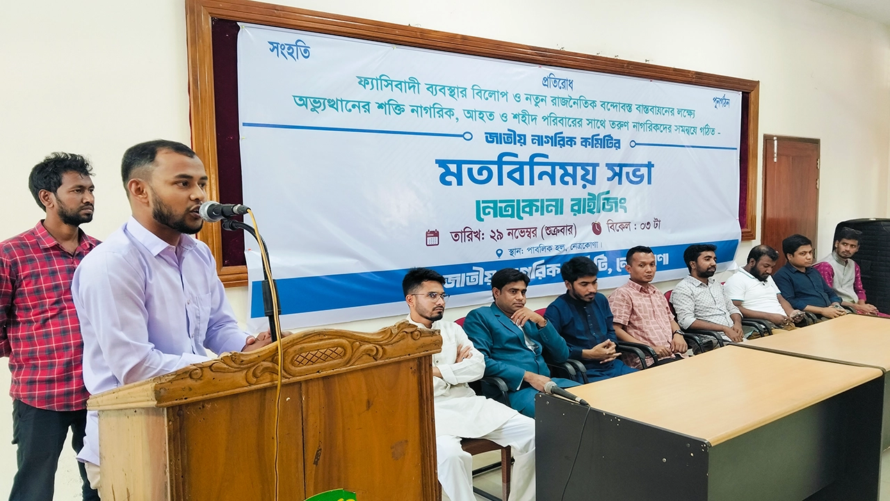 নেত্রকোনায় জাতীয় নাগরিক কমিটি এর মতবিনিময় সভা অনুষ্ঠিত হয়েছে। ‘নেত্রকোনা রাইজিং’ শিরোনামে ফ্যাসিবাদী ব্যবস্থার বিলোপ ও নতুন রাজনৈতিক বন্দোবস্ত বাস্তবায়নের লক্ষ্যে অভ্যুত্থানের শক্তি নাগরিক, আহত ও শহীদ পরিবারের সঙ্গে তরুণ নাগরিকদের এ সভা হয়।